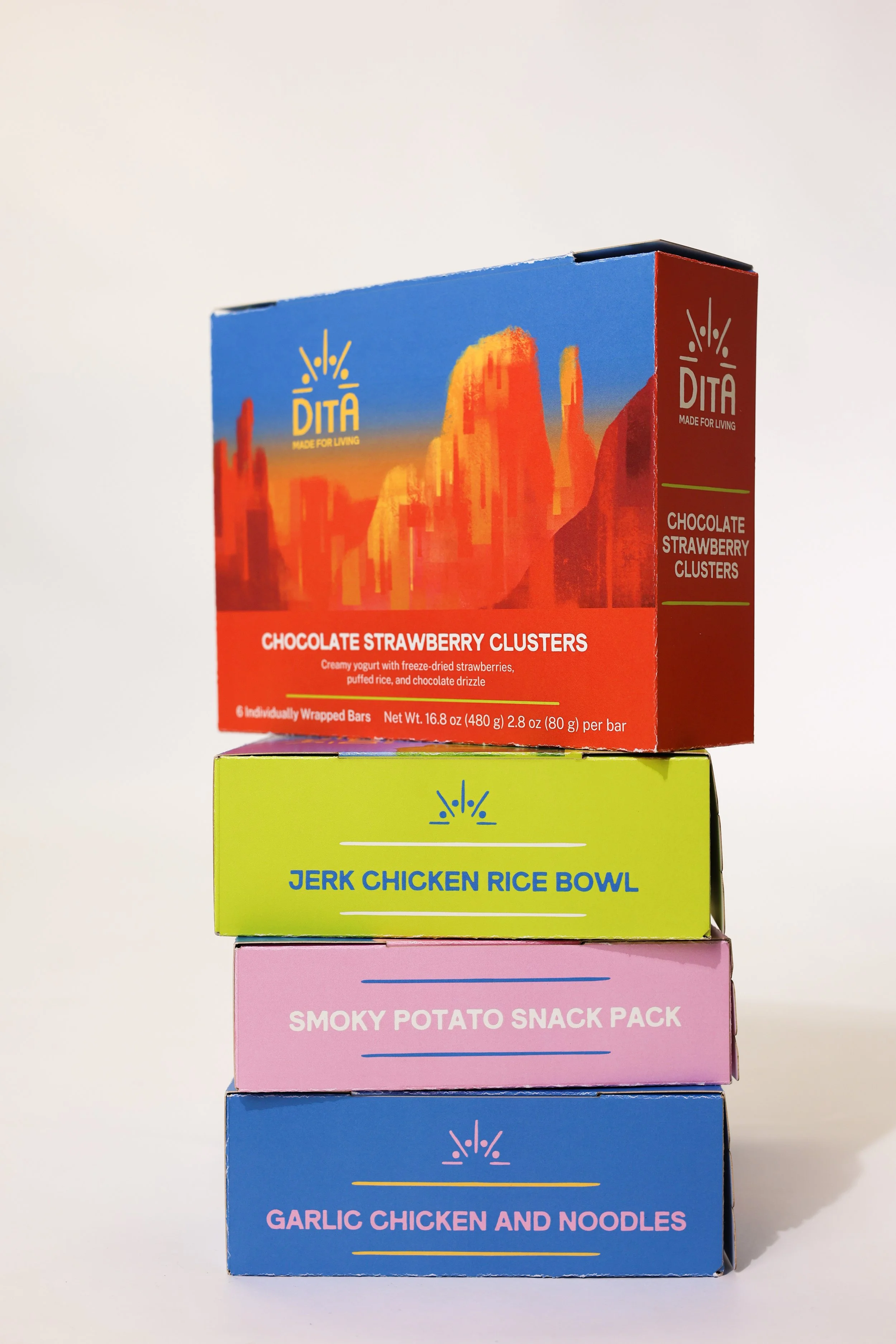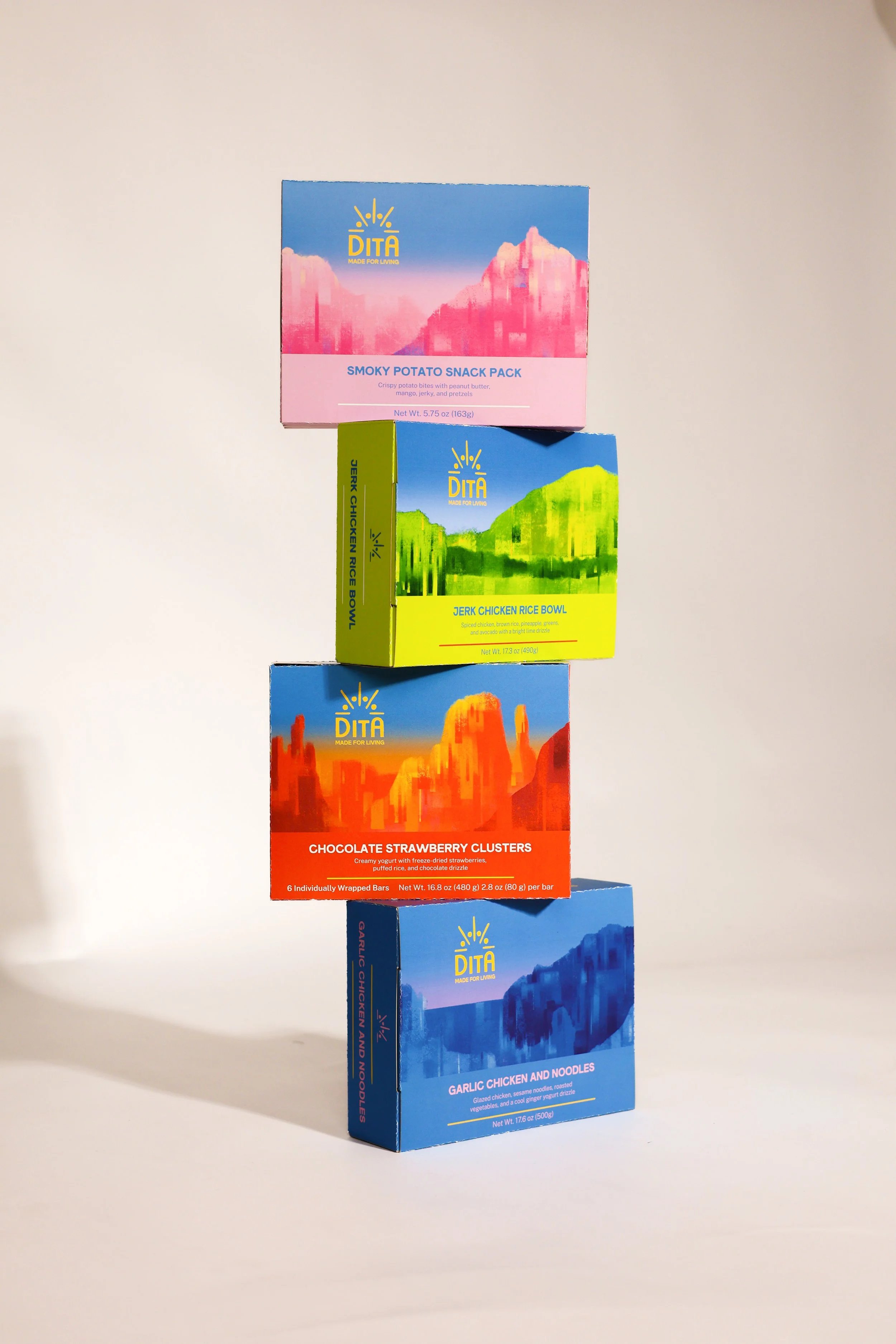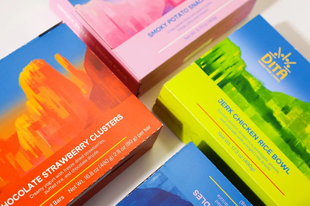 Designed for teens developing independence and lifelong habits, Dita encourages a more confident and balanced relationship with food. The brand uses clear, neutral, and encouraging language that reframes food as a natural part of a full, well-lived life rather than a moral choice. It is structured around the rhythm of a full day. Distinct, color-coded packaging represent breakfast, lunch, snack, and dinner, making decisions feel clear, approachable, and easy to navigate.