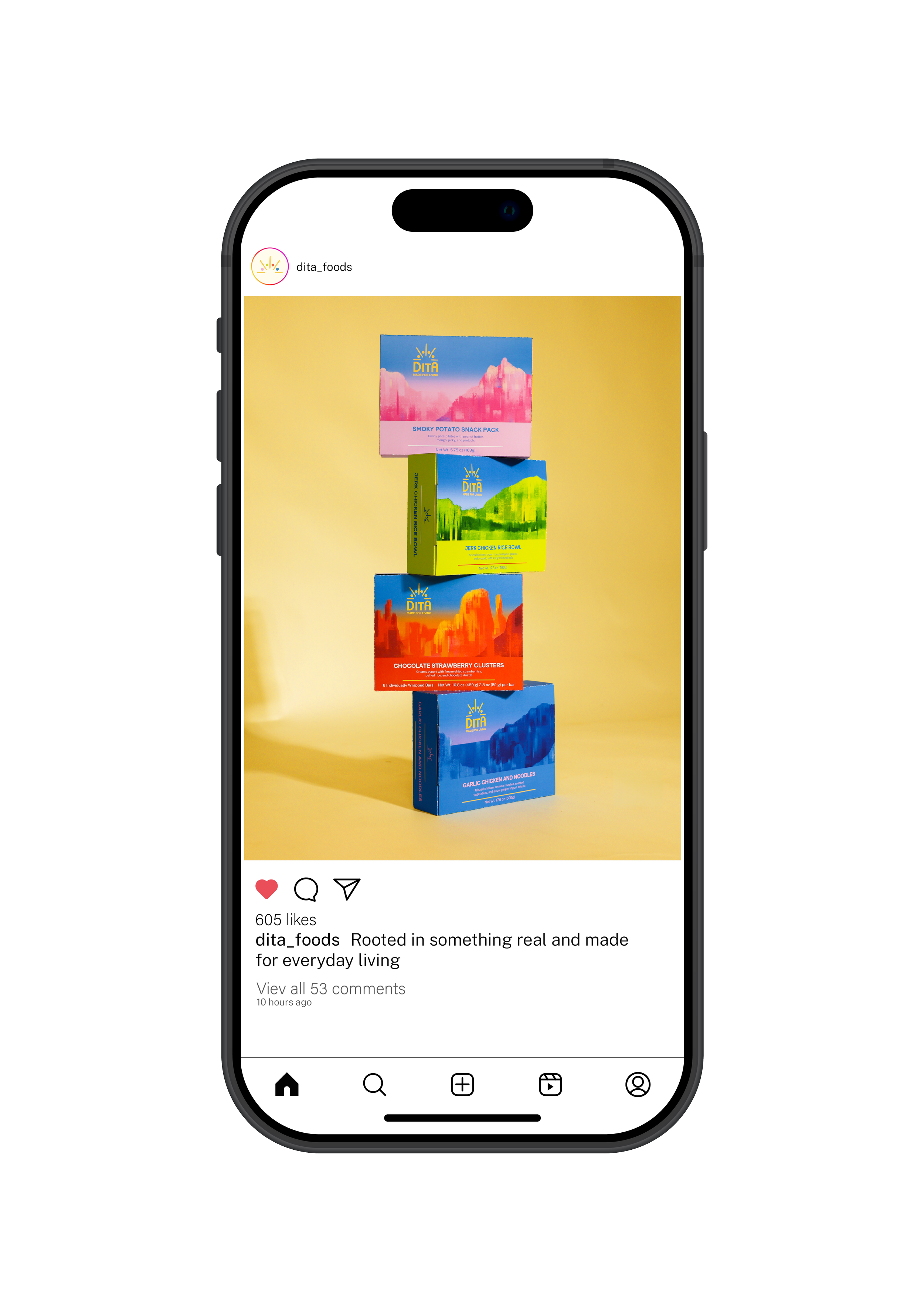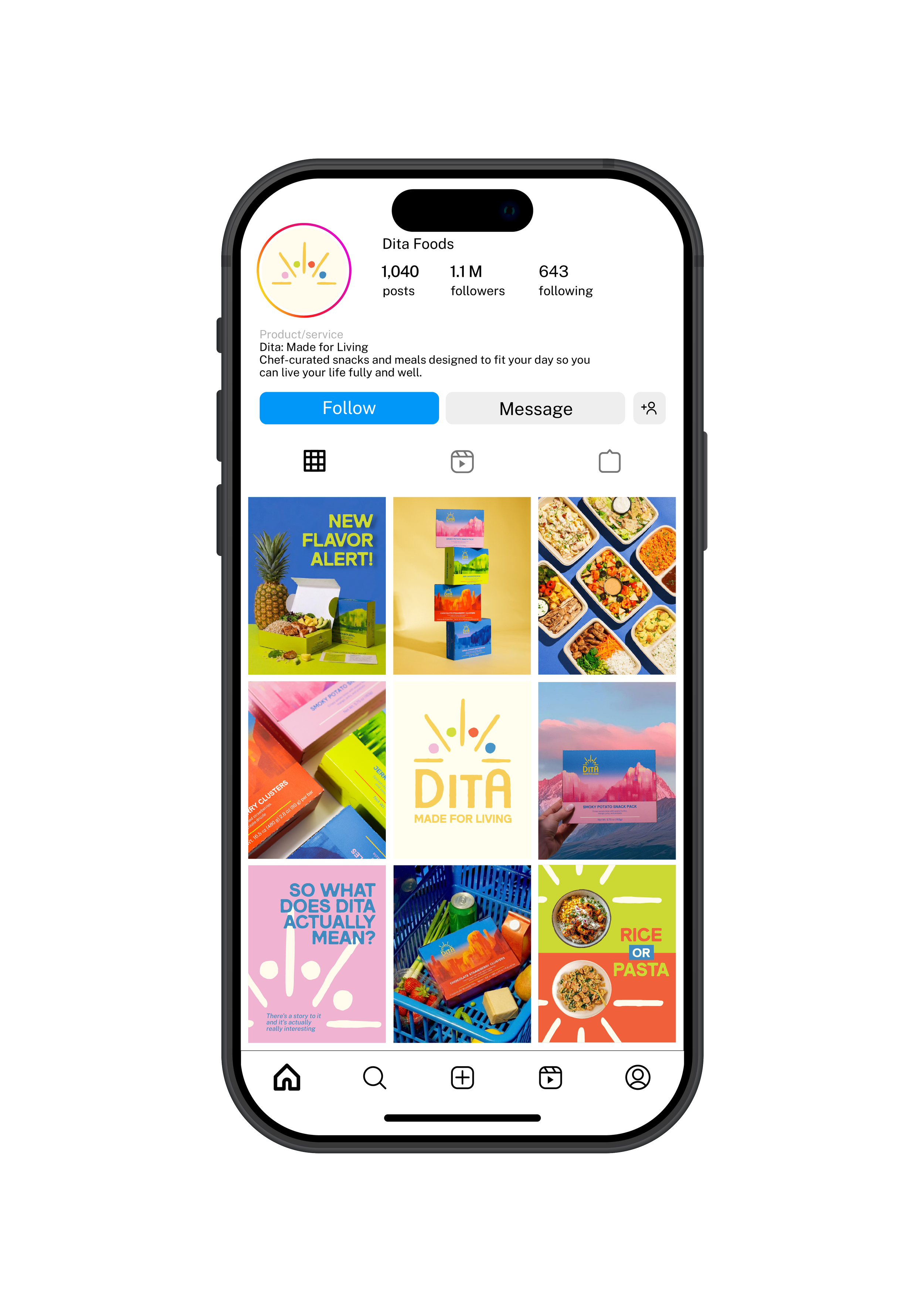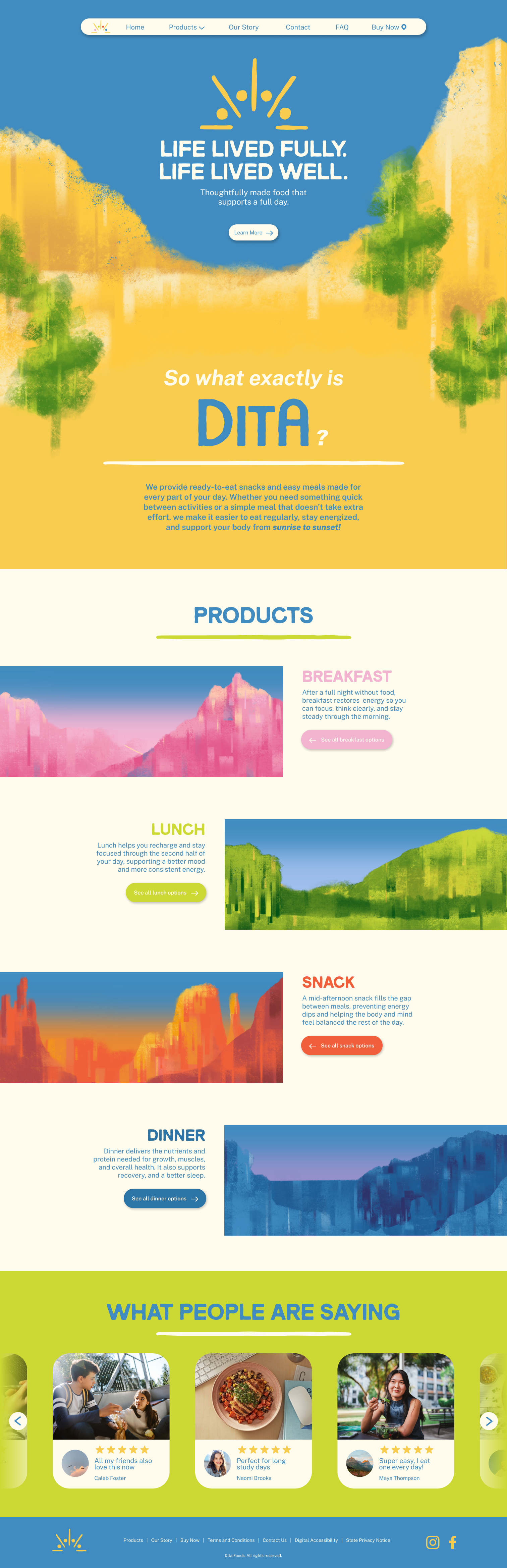 Designed for teens developing independence and lifelong habits, Dita encourages a more confident and balanced relationship with food. The brand uses clear, neutral, and encouraging language that reframes food as a natural part of a full, well-lived life rather than a moral choice. It is structured around the rhythm of a full day. Distinct, color-coded packaging represent breakfast, lunch, snack, and dinner, making decisions feel clear, approachable, and easy to navigate.
